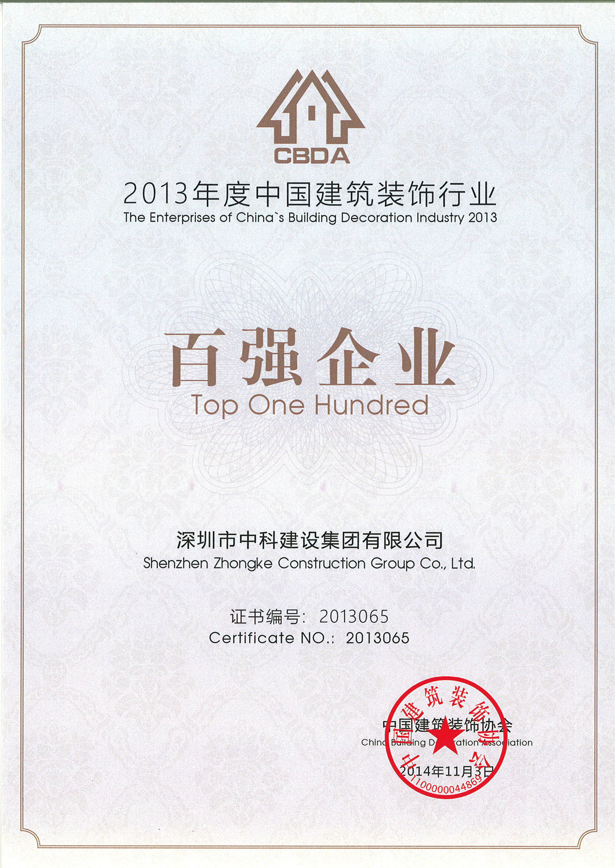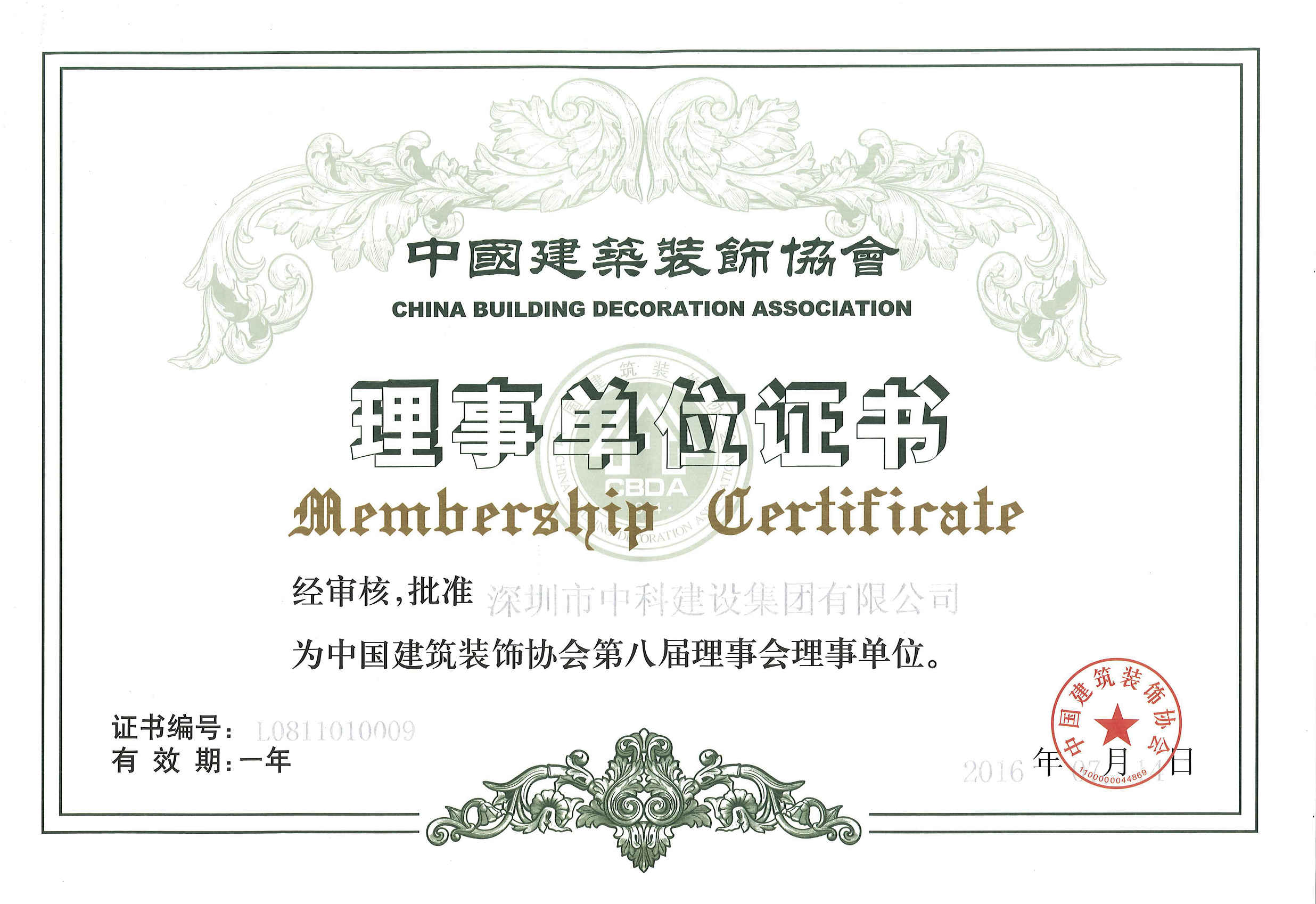 中國建筑裝飾理事單位證書