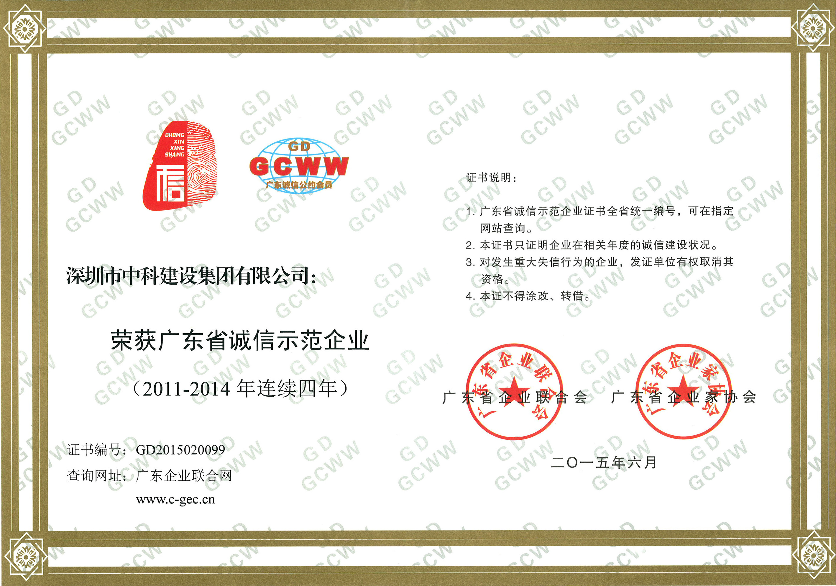 中科建設(shè)集團(tuán)連續(xù)4年榮獲《廣東省誠(chéng)信示范企業(yè)》稱(chēng)號(hào)