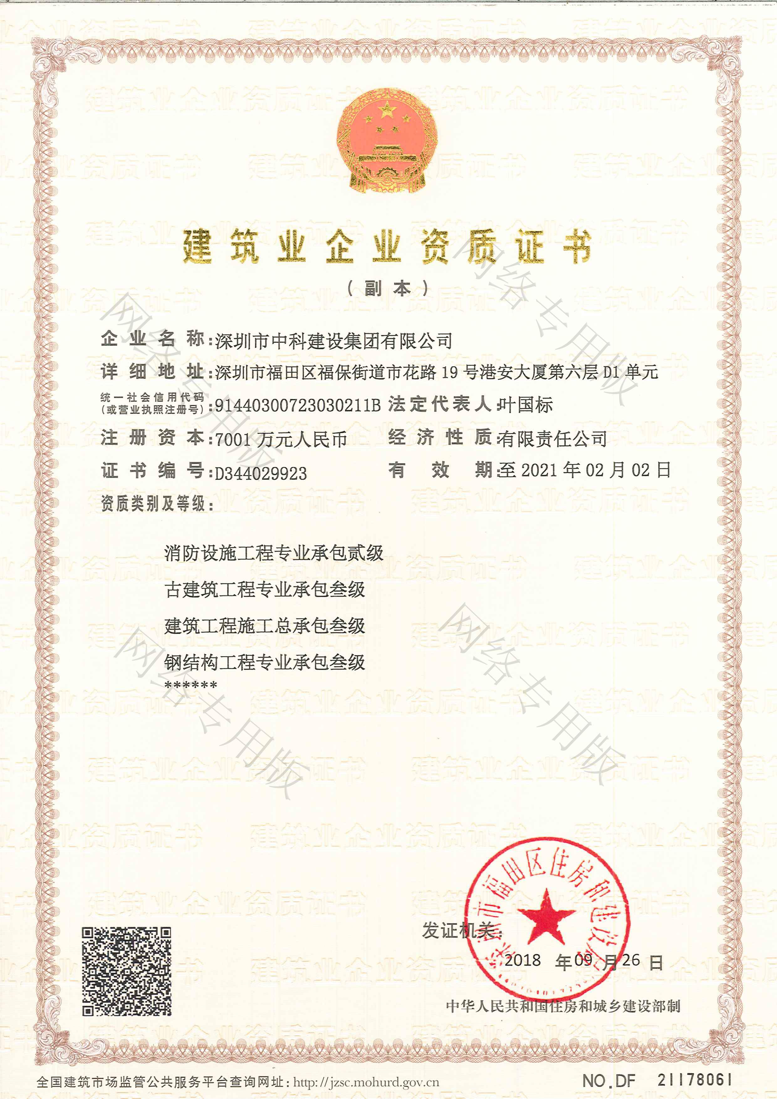 近日,經(jīng)深圳市福田區(qū)住房與建設(shè)局審核批準(zhǔn),我司獲得建筑工程施工總承包叁級(jí)及鋼結(jié)構(gòu)工程專業(yè)承包叁級(jí)兩項(xiàng)資質(zhì)。